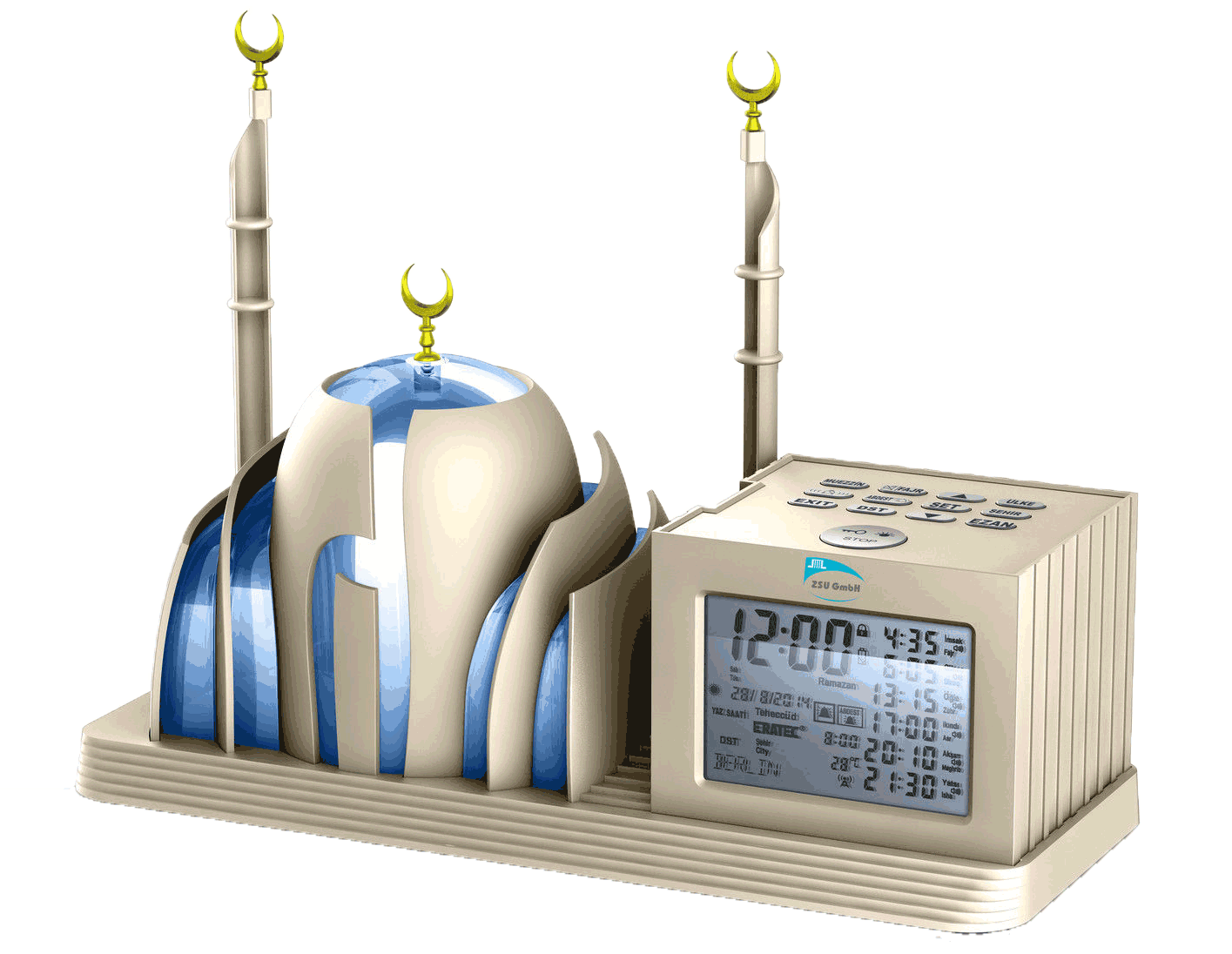 * Calls Azan in 20 different tunes (Turkish, Mecca, Egypt, Jerusalem).